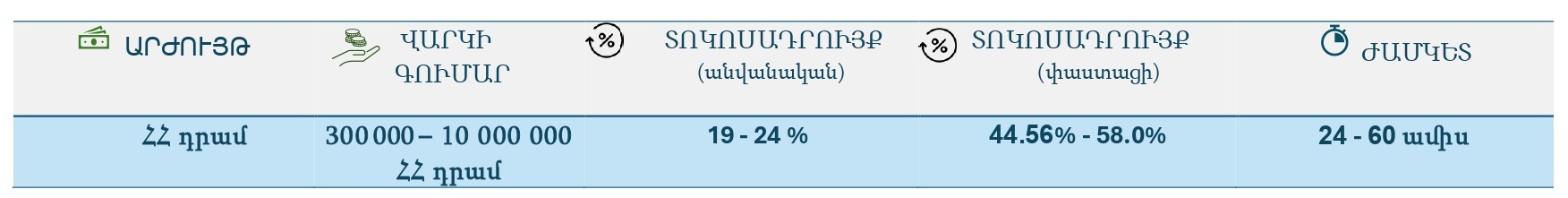 *Ընդհանուր վարկերի ամենամսյա մարումները չպետք է գերազանցեն եկամուտների 60%-ը |